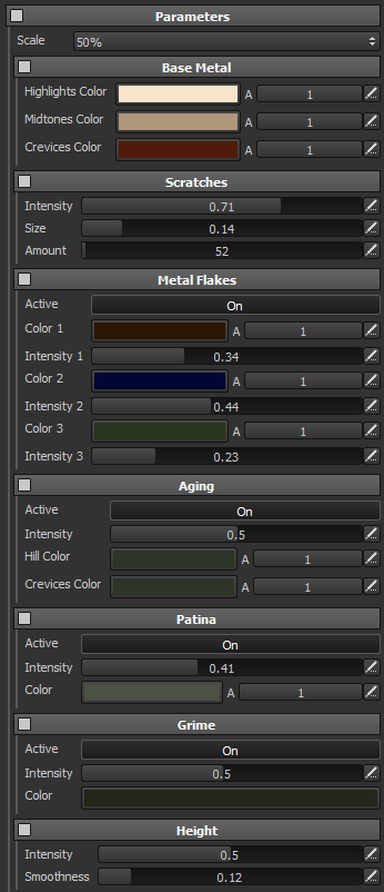 A substance material for Substance Painter and Substance Designer, using the Metallic PBR workflow (Base Color, Roughness, Height, Metallic), in the sbsar format. The material preview was made in Substance Designer.